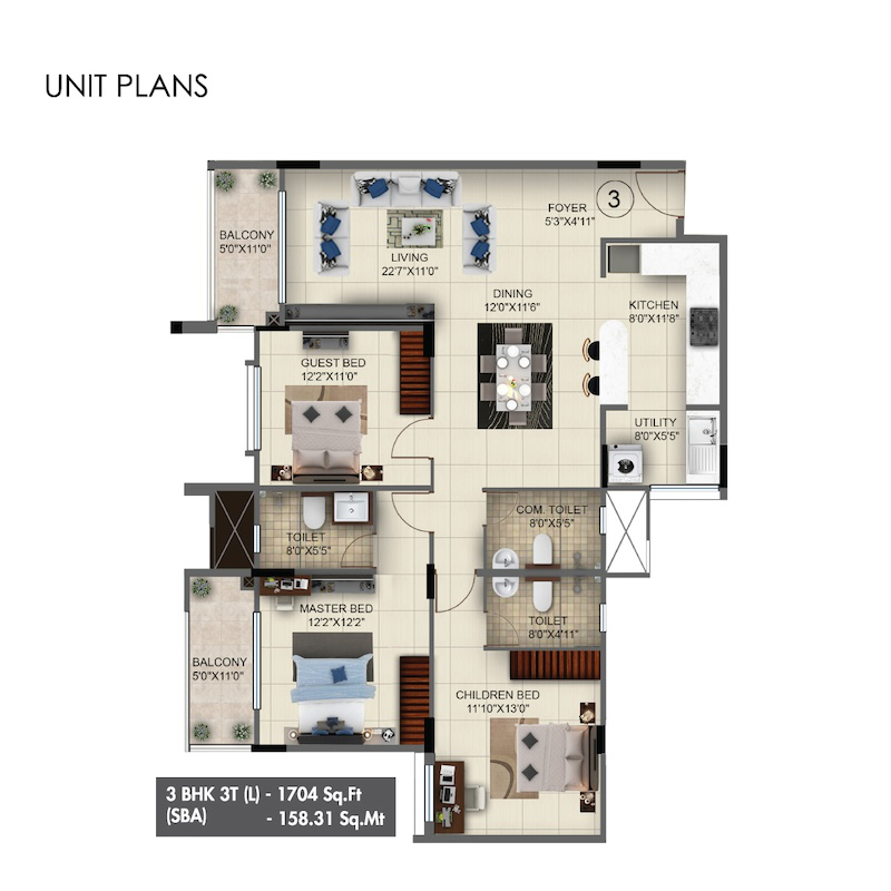 The area of 3 BHK apartments in Sattva Anugraha ranges from 1186 to 1490 sq.ft.